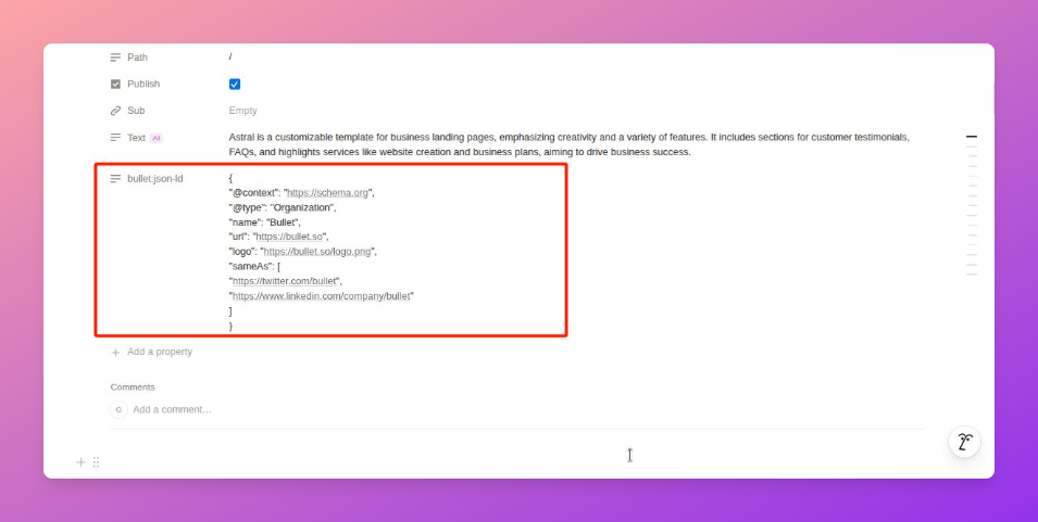 3. **Add Your JSON-LD Schema**: For each page in your database, paste the relevant JSON-LD schema into the value of`bullet:json-ld` property. (You can use AI or automation like Zapier to fill this property.