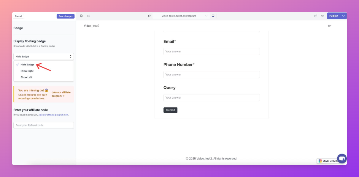 The badge of the Bullet can be customized from the Badge section in Theme settings. This allows you to control its display, including the option to hide the floating badge.